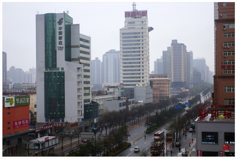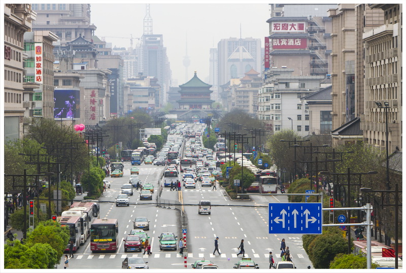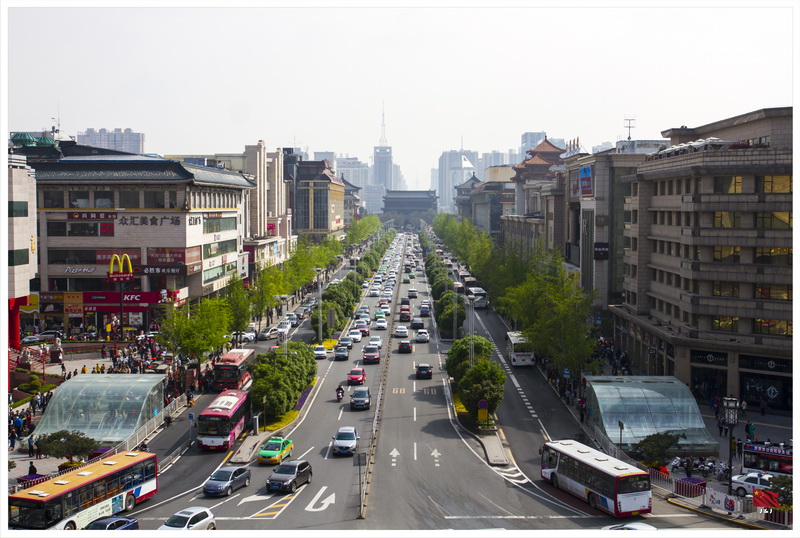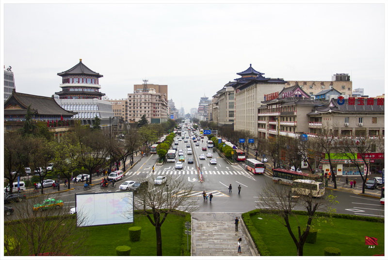 離開書院門後到了鐘樓, 在鐘樓上可以看到整個西安城的景色, 當然要趁著天氣好的時候看一看了. 從這裡可以清楚看到東南西北四條大街分別的連接到遠遠的四個城門之上, 可以幻想一下當時整個皇宮規模之大.